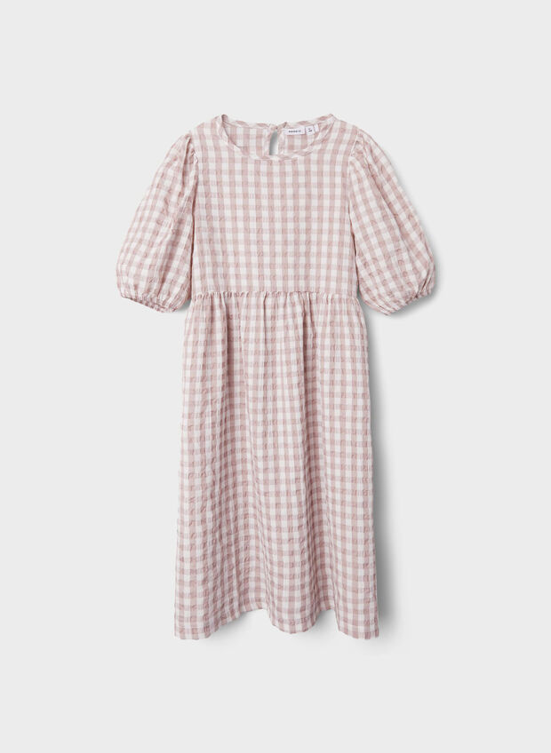 Abito da ragazza firmato in misto poliestere a fantasia, maniche corte e spallina arricciata.