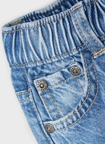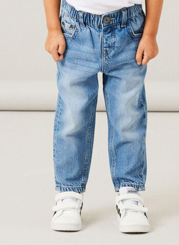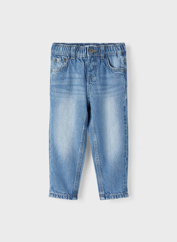 Jeans modello tapered da bambino con vita regolabile da coulisse con bottoni.