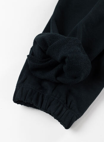 Elastico in vita con coulisse, tasche laterali e polsini a costine.