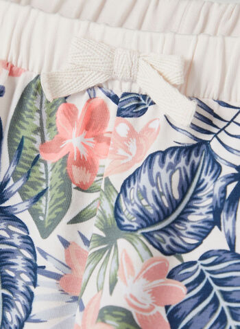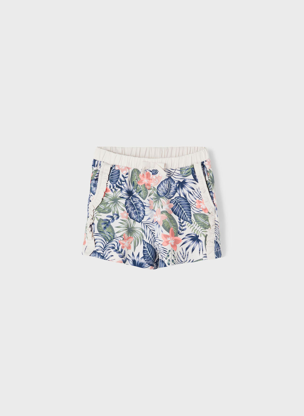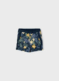 Short da bambina con vita elasticizzata, tasche laterali decorate con merletto e stampa floreale.