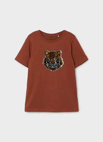 Maxi stampa frontale con inserti in paillettes.
