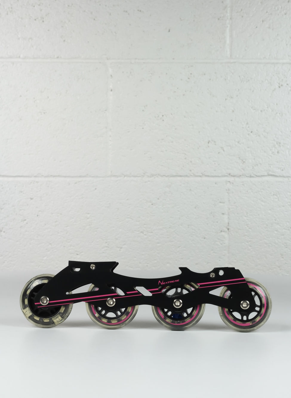 Kit pattini in linea: asse ruota in alluminio, spessore 2 mm. Ruote in PVC ø 64 mm, anteriore con luci colorate di sicurezza.