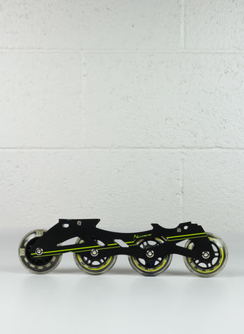 Kit pattini in linea: asse ruota in alluminio, spessore 2 mm. Ruote in PVC ø 70 mm, anteriore con luci colorate di sicurezza.