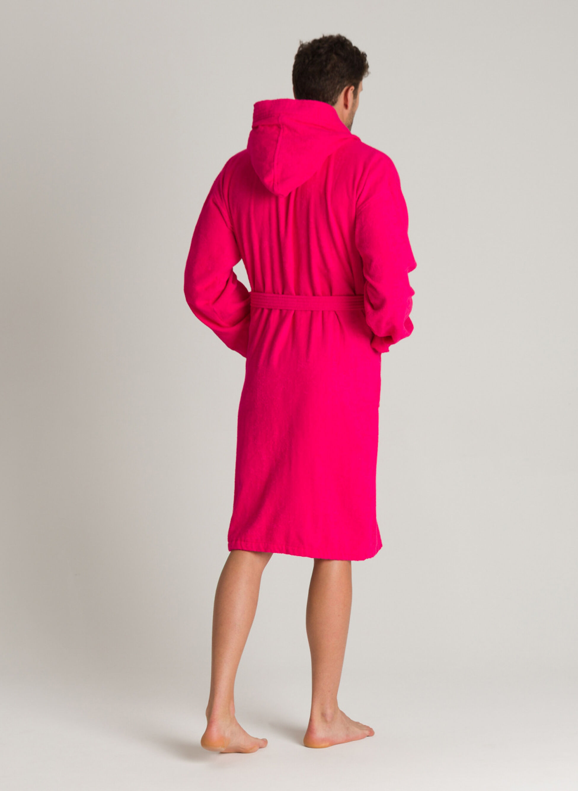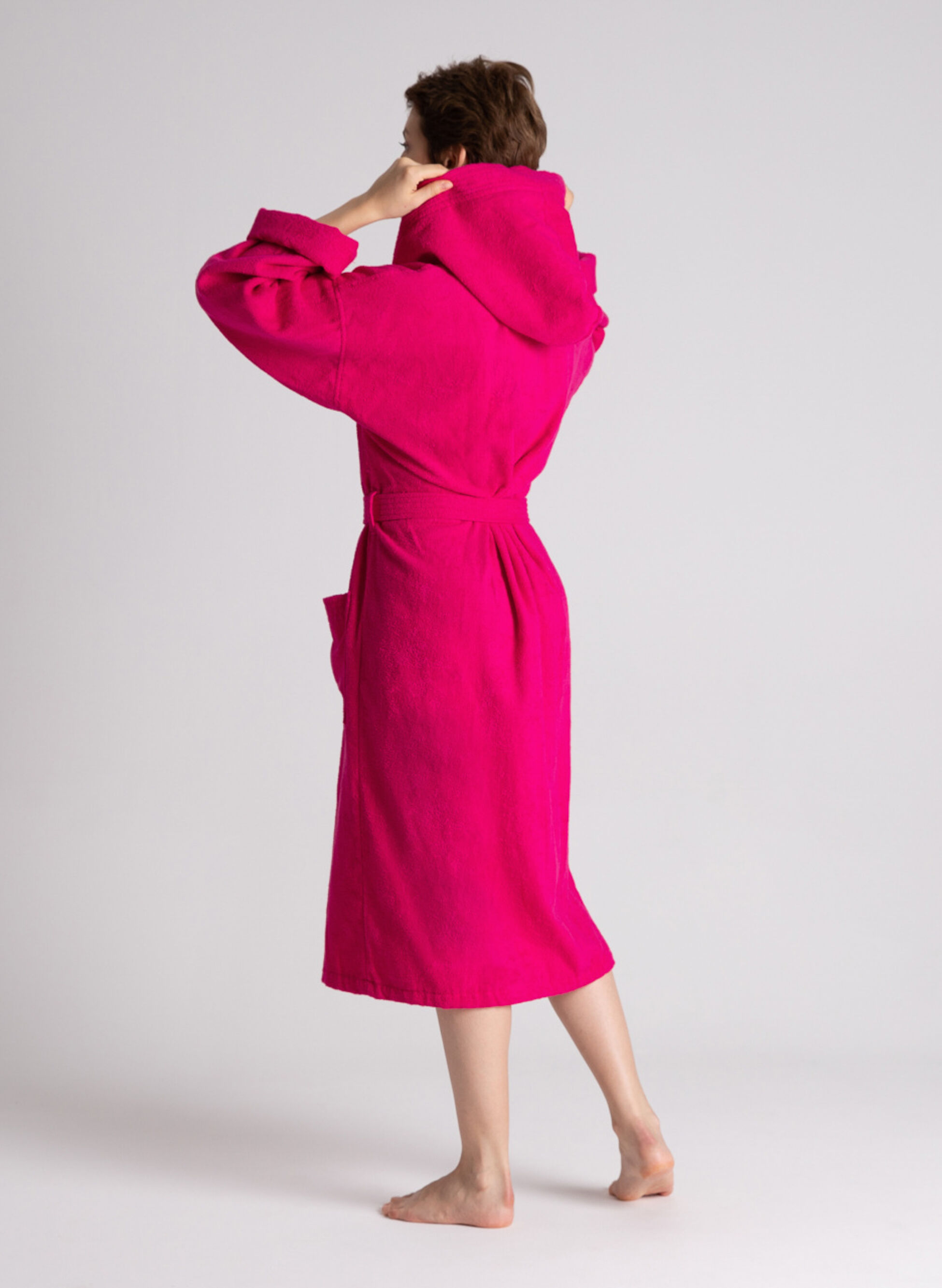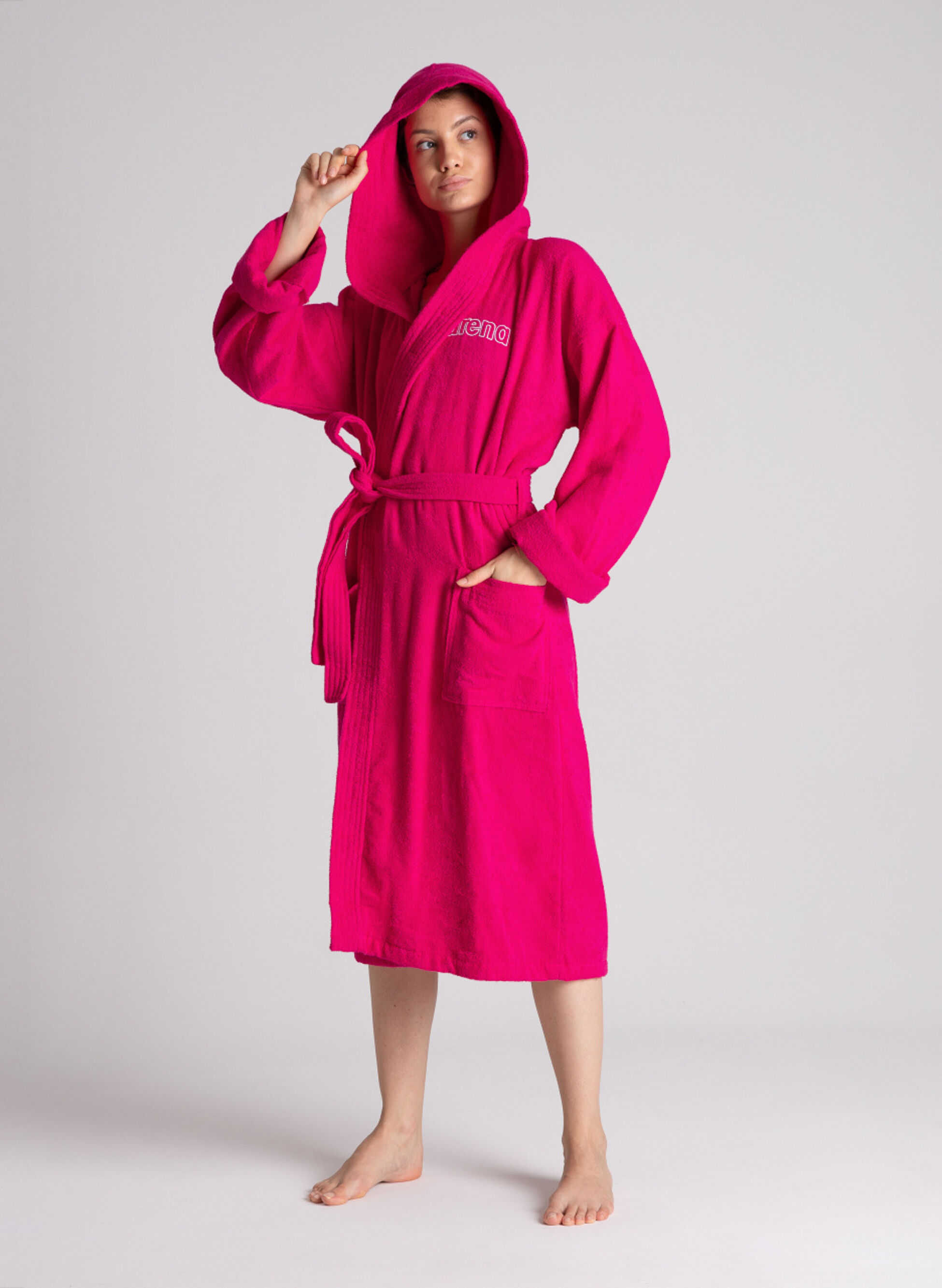 Accappatoio da donna realizzato in morbida spugna assorbente con cappuccio e chiusura con cintura in vita.
