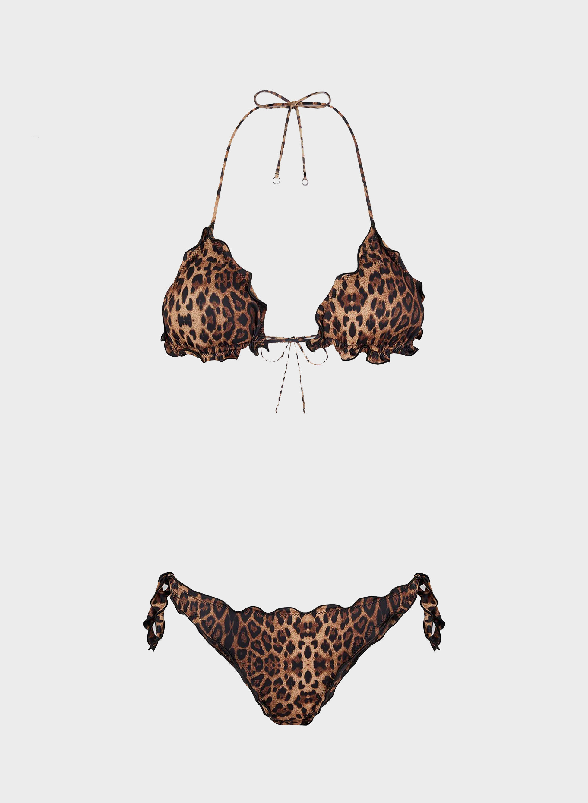 Bikini da donna F**k con reggiseno a triangolo e slip modello brasiliano regolabile a fantasia animalier, arricciato sui bordi. Il reggiseno è dotato di imbottitura interna estraibile.