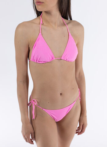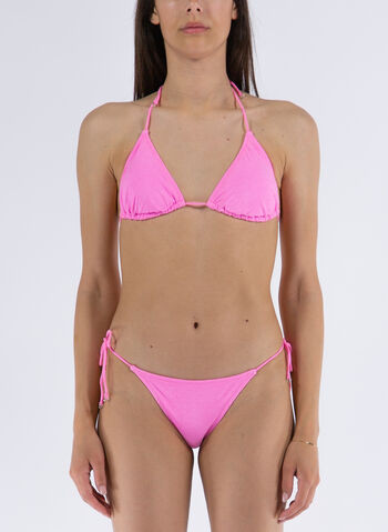 Reggiseno a triangolo con imbottitura rimovibile, slip modello brasiliana con fiocchetti laterali.
