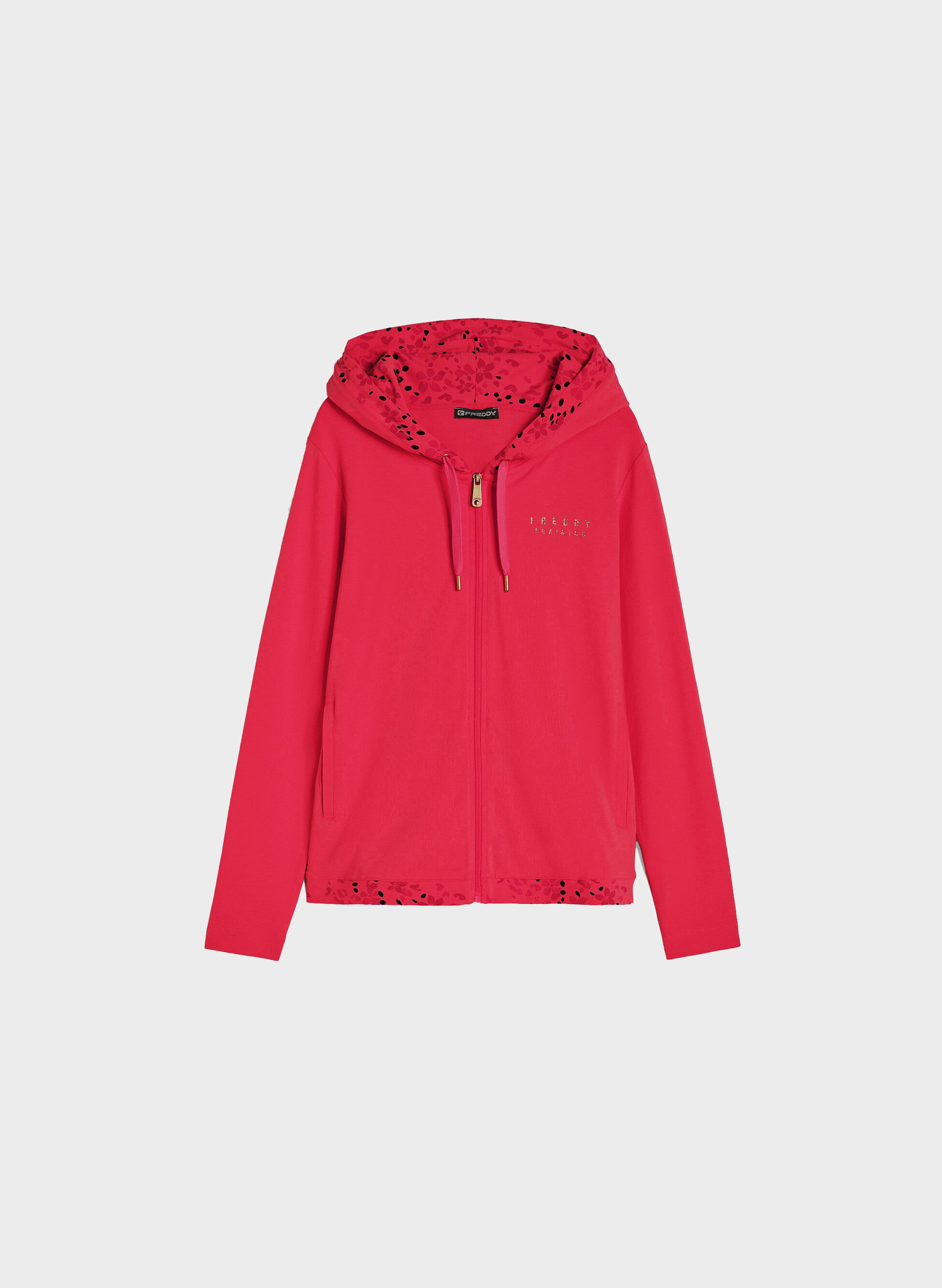 Felpa Freddy con motivo floreale nel lato interno del cappuccio e sul fondo elasticizzato.