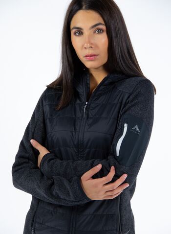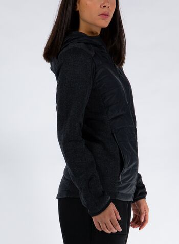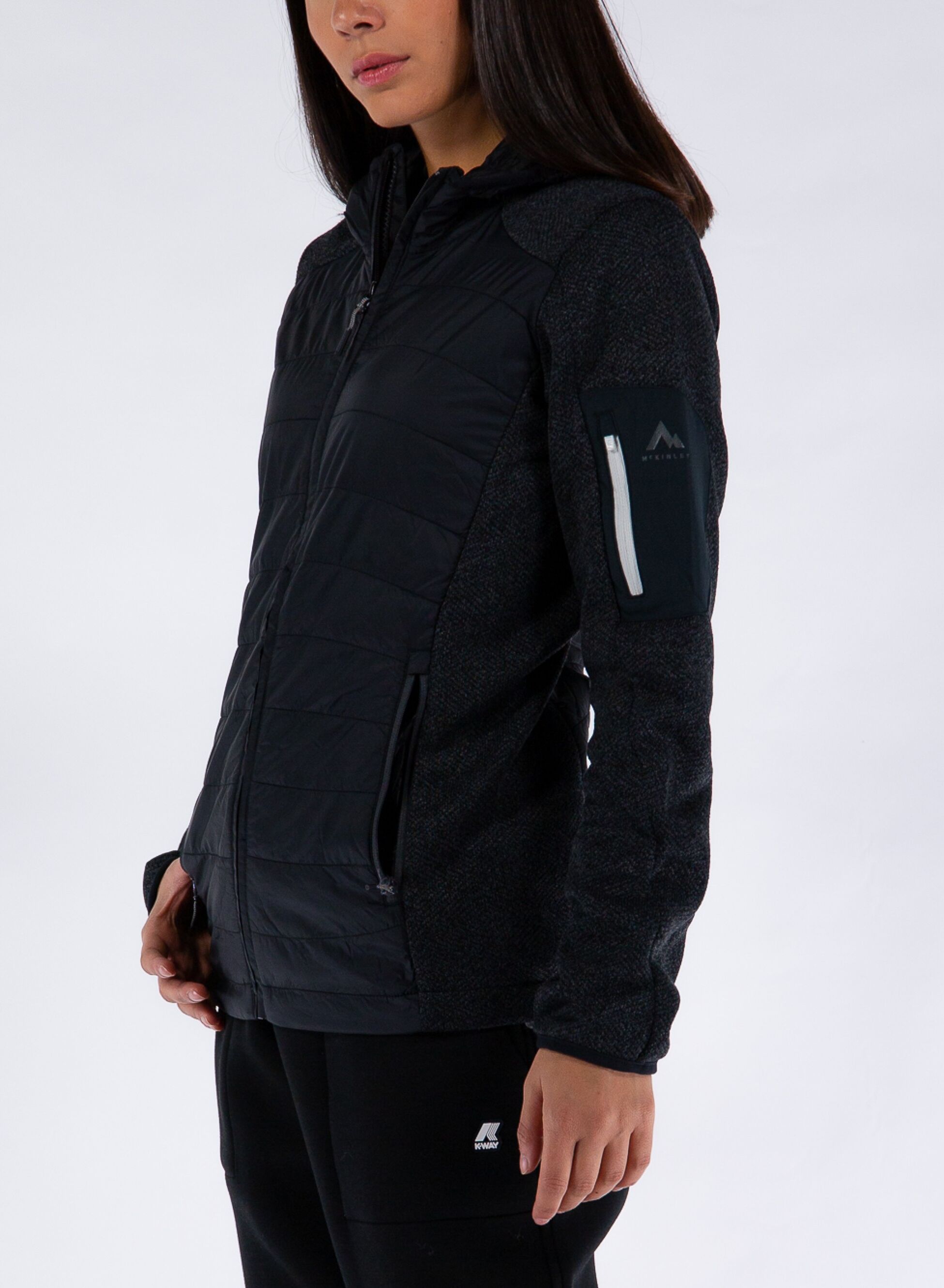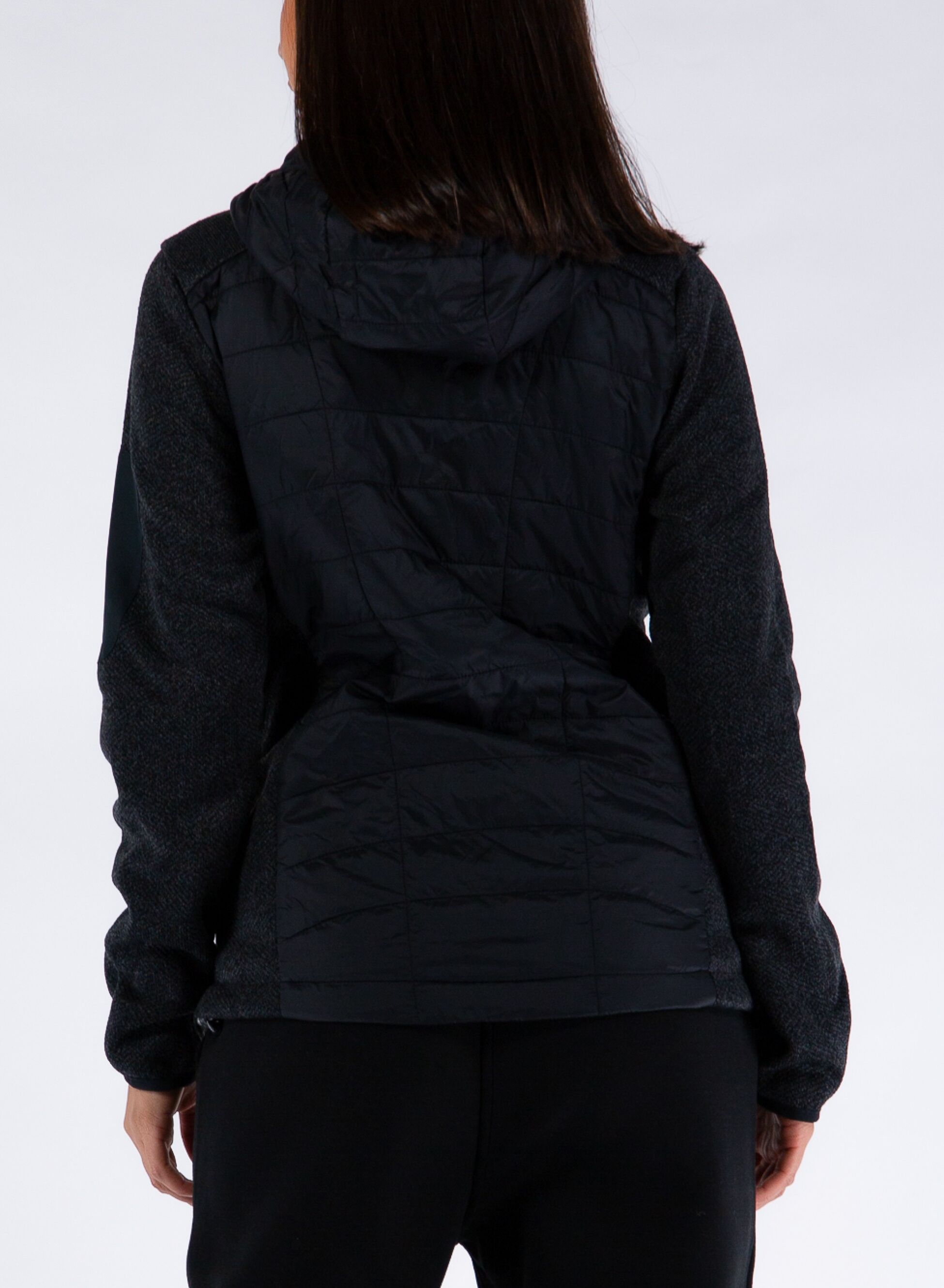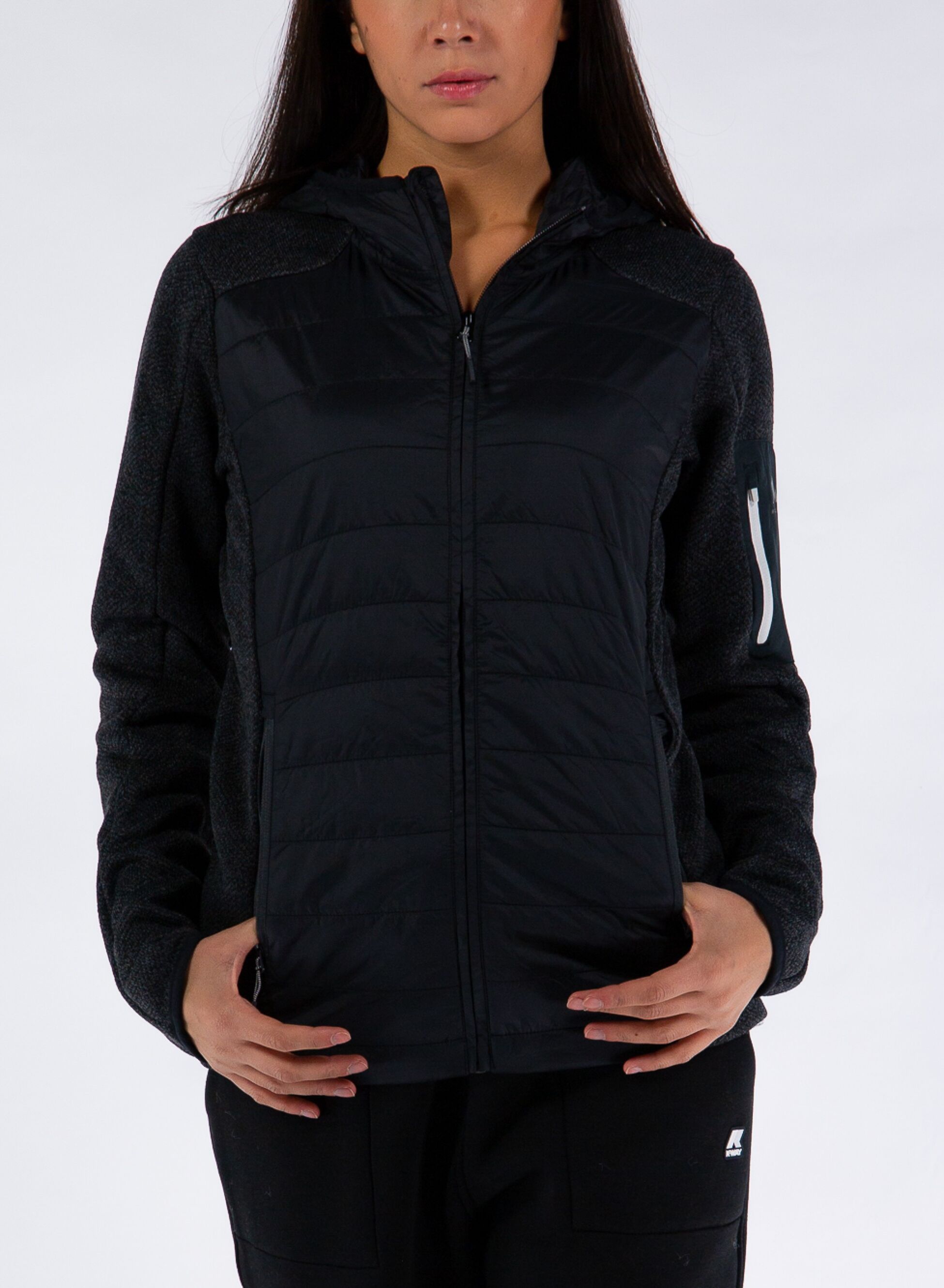 Chiusura full zip, tasche con cerniera a vista e polsini e fondo con fascia elastica.