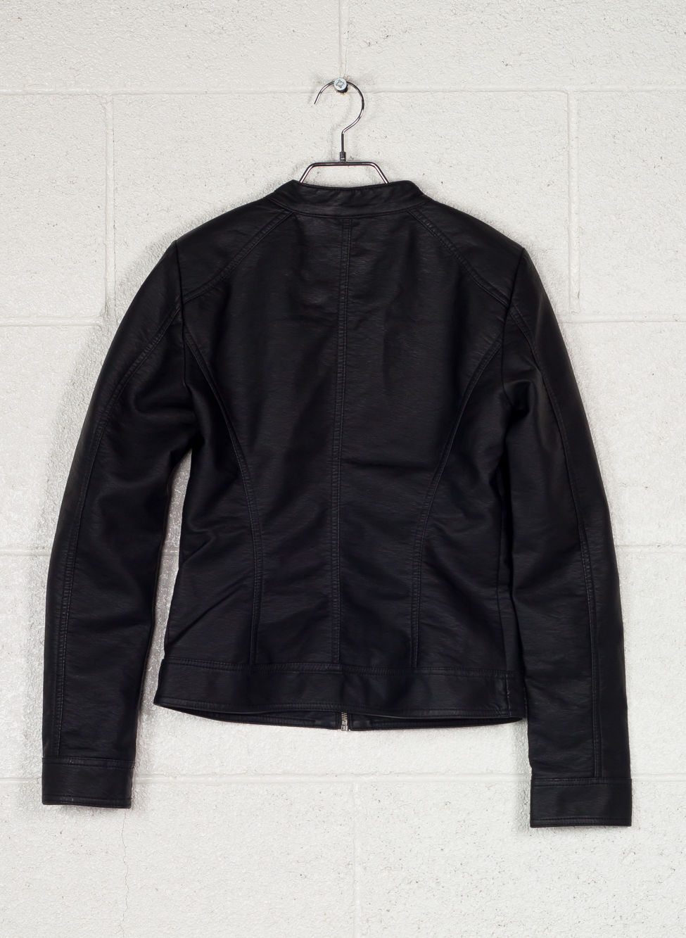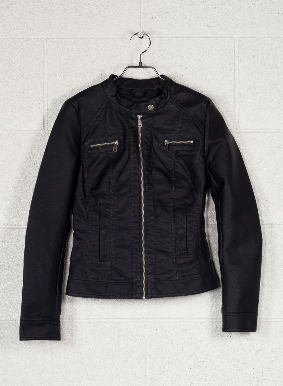 Giacca da donna in pelle sintetica con chiusura full-zip e girocollo con bottone.
