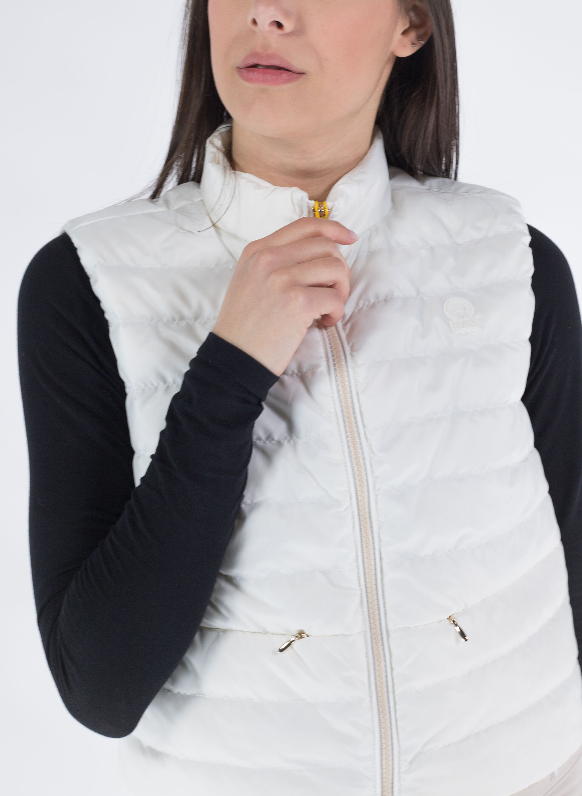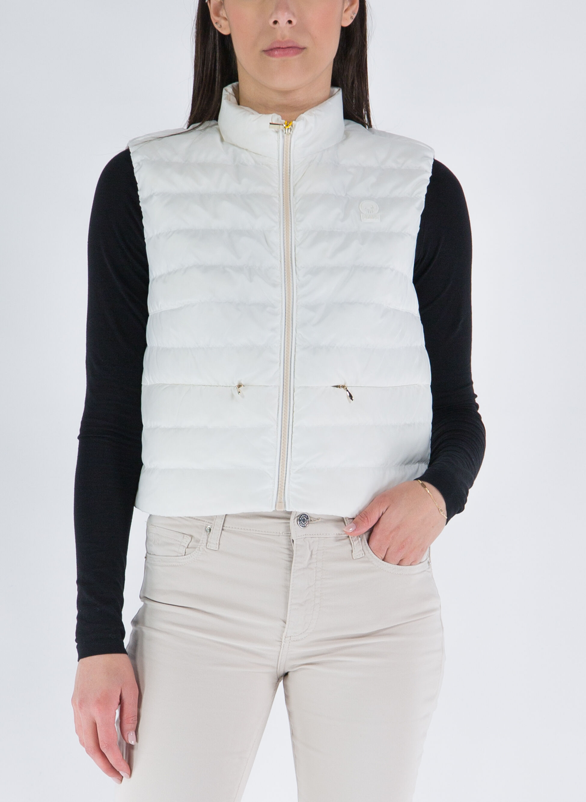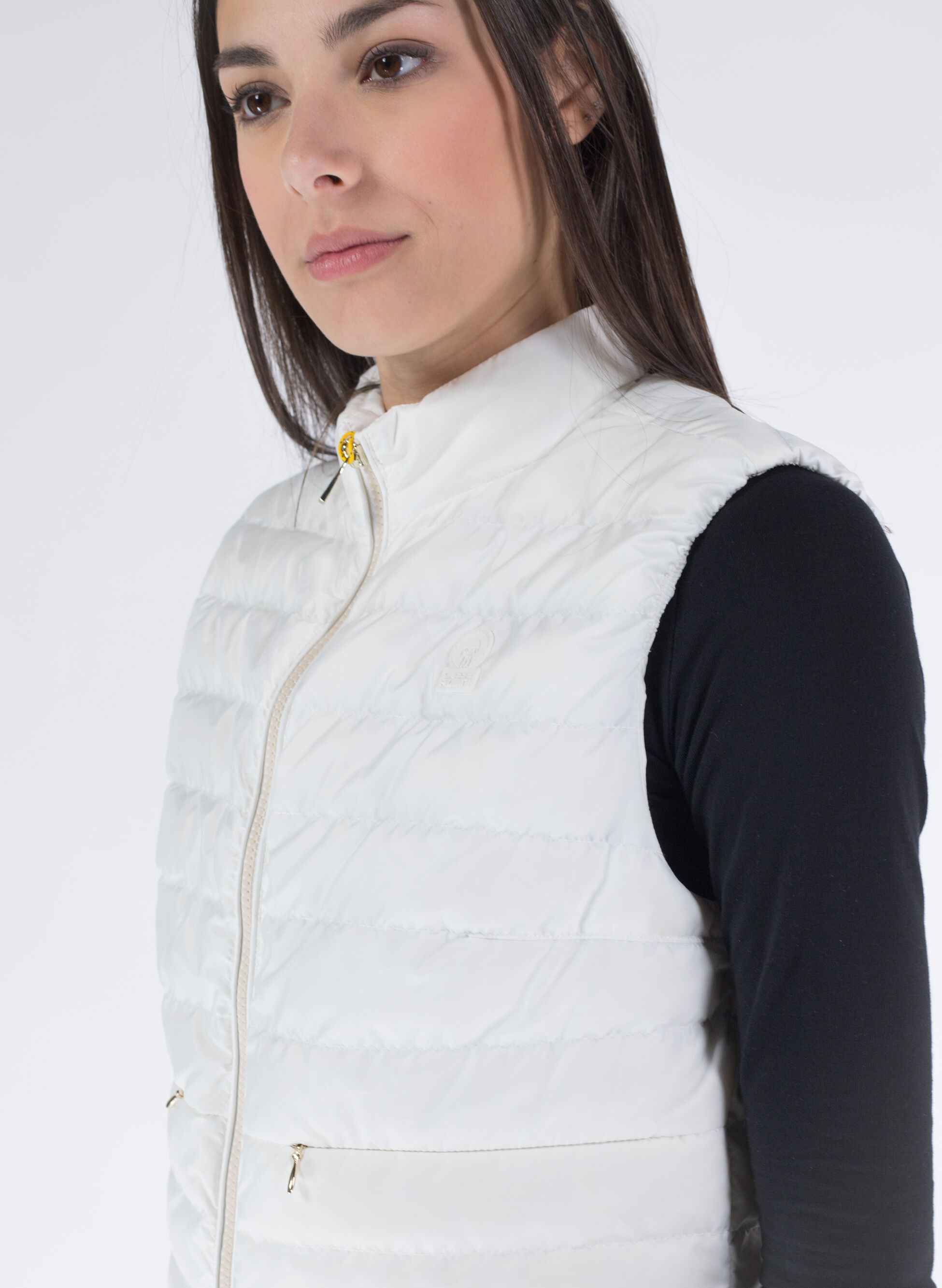 Piumino smanicato trapuntato con chiusura frontale con zip e tasche anteriori con cerniera invisibile.