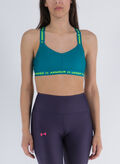 Reggiseno sportivo Under Armour da donna con logo pattern sotto il seno e sulle spalline incrociate sul retro.