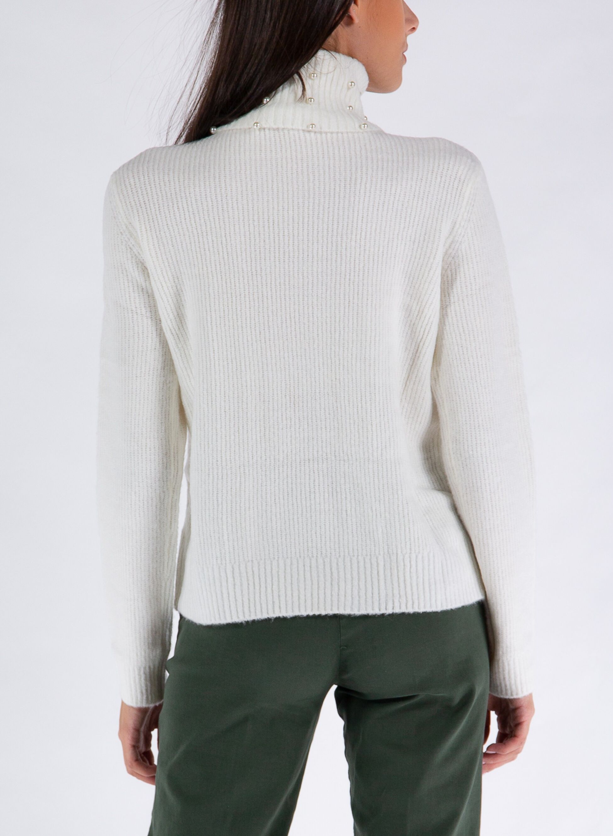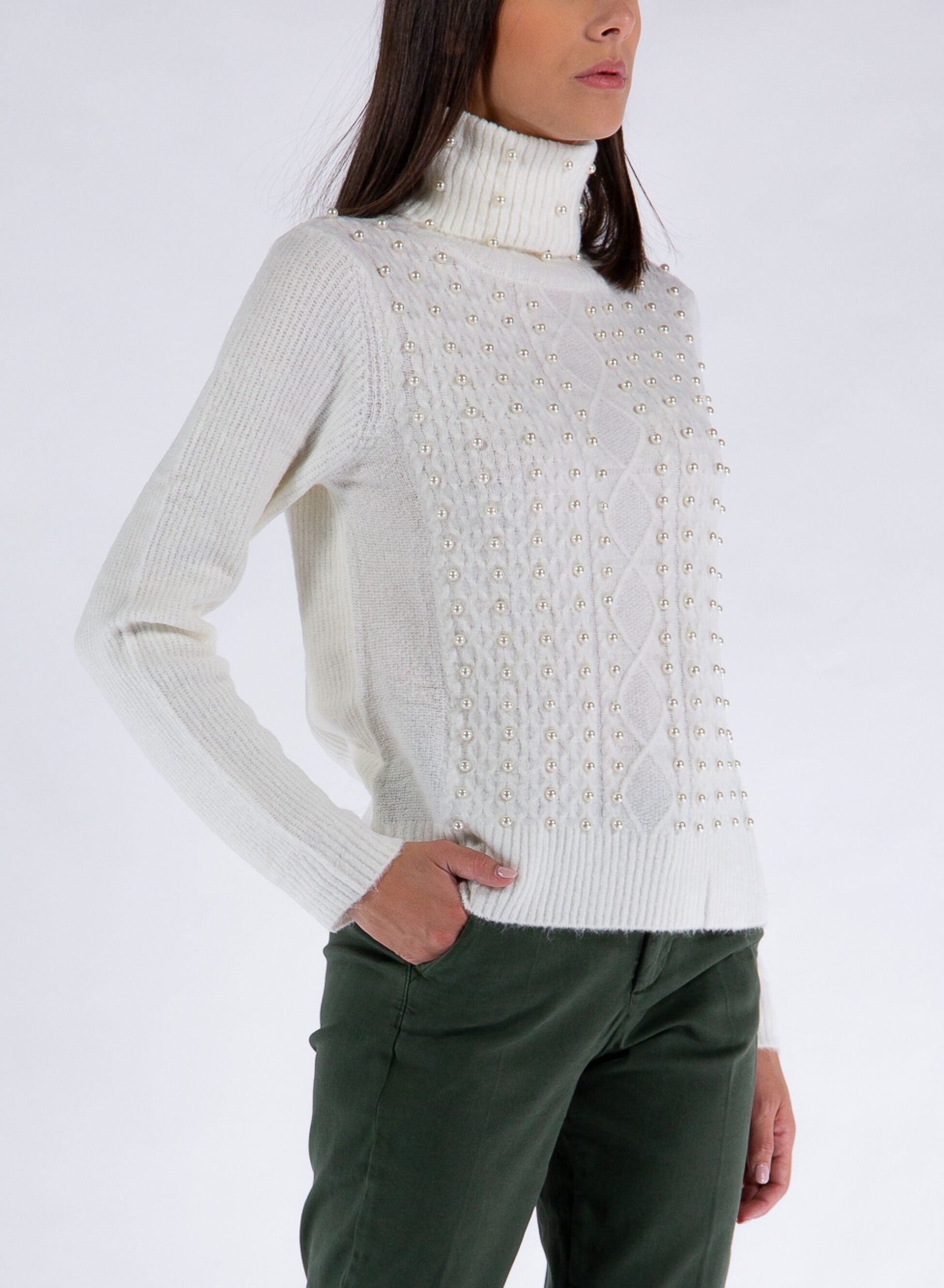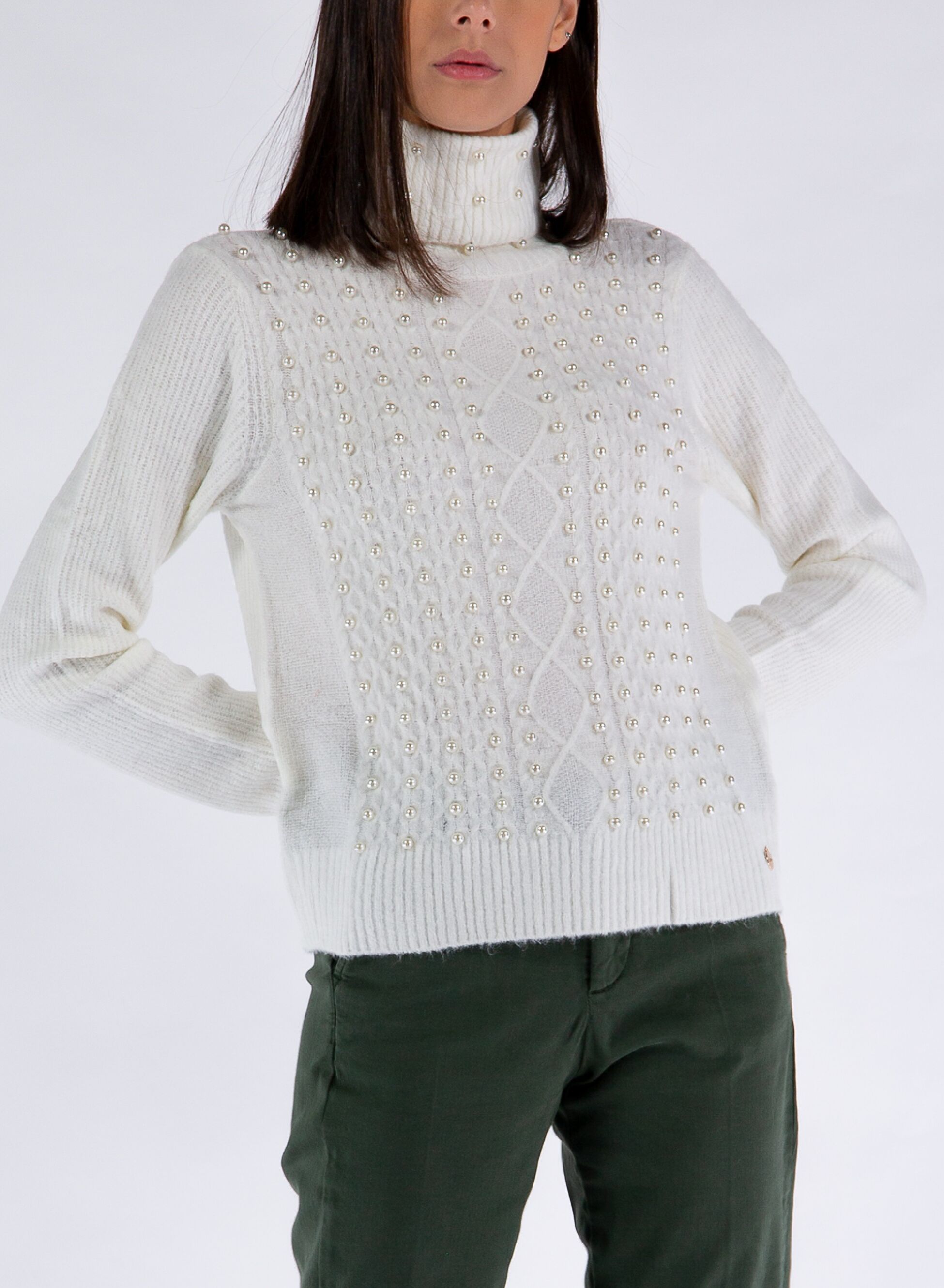Maglione da donna a collo alto con motivo a trecce e decorazioni in perle applicate sul davanti.