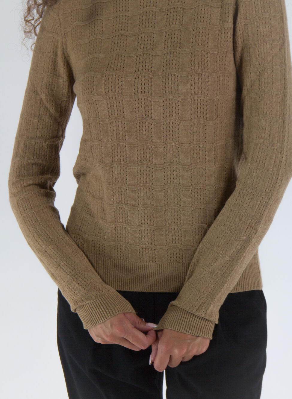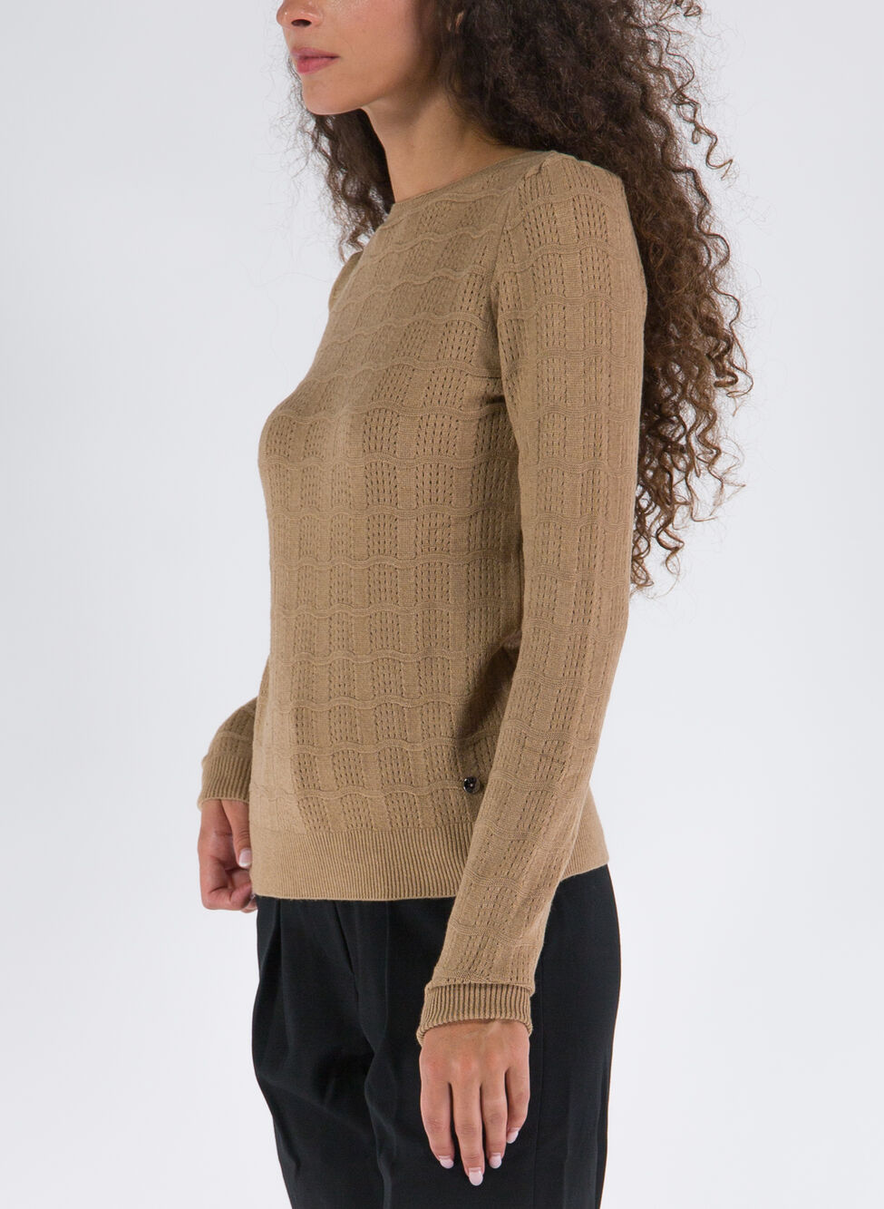 Maglione da donna realizzato in misto viscosa lavorato a maglia a maniche lunghe con scollo a barca.
