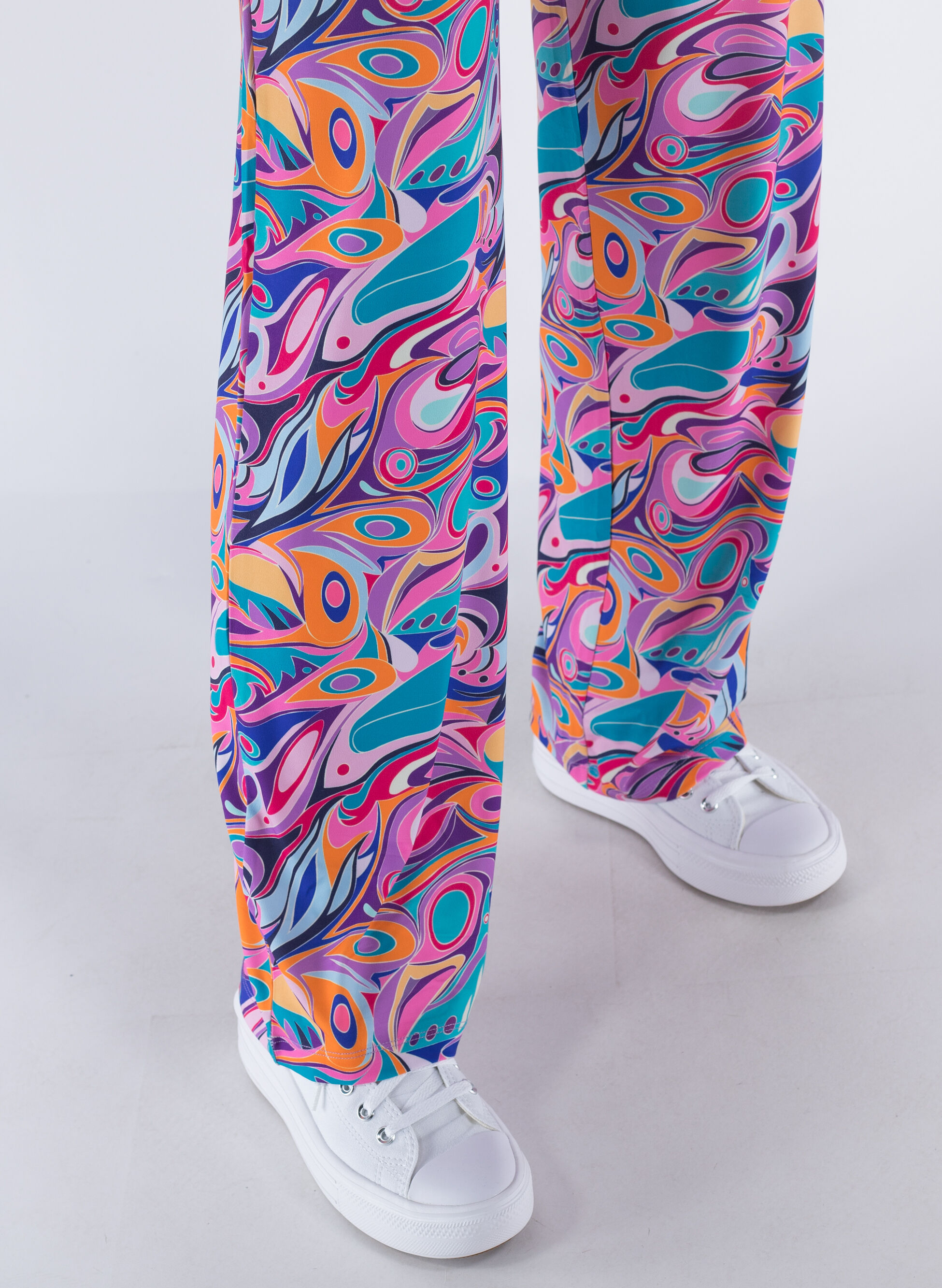 Pantalone da donna a palazzo con fantasia multicolor astratta.