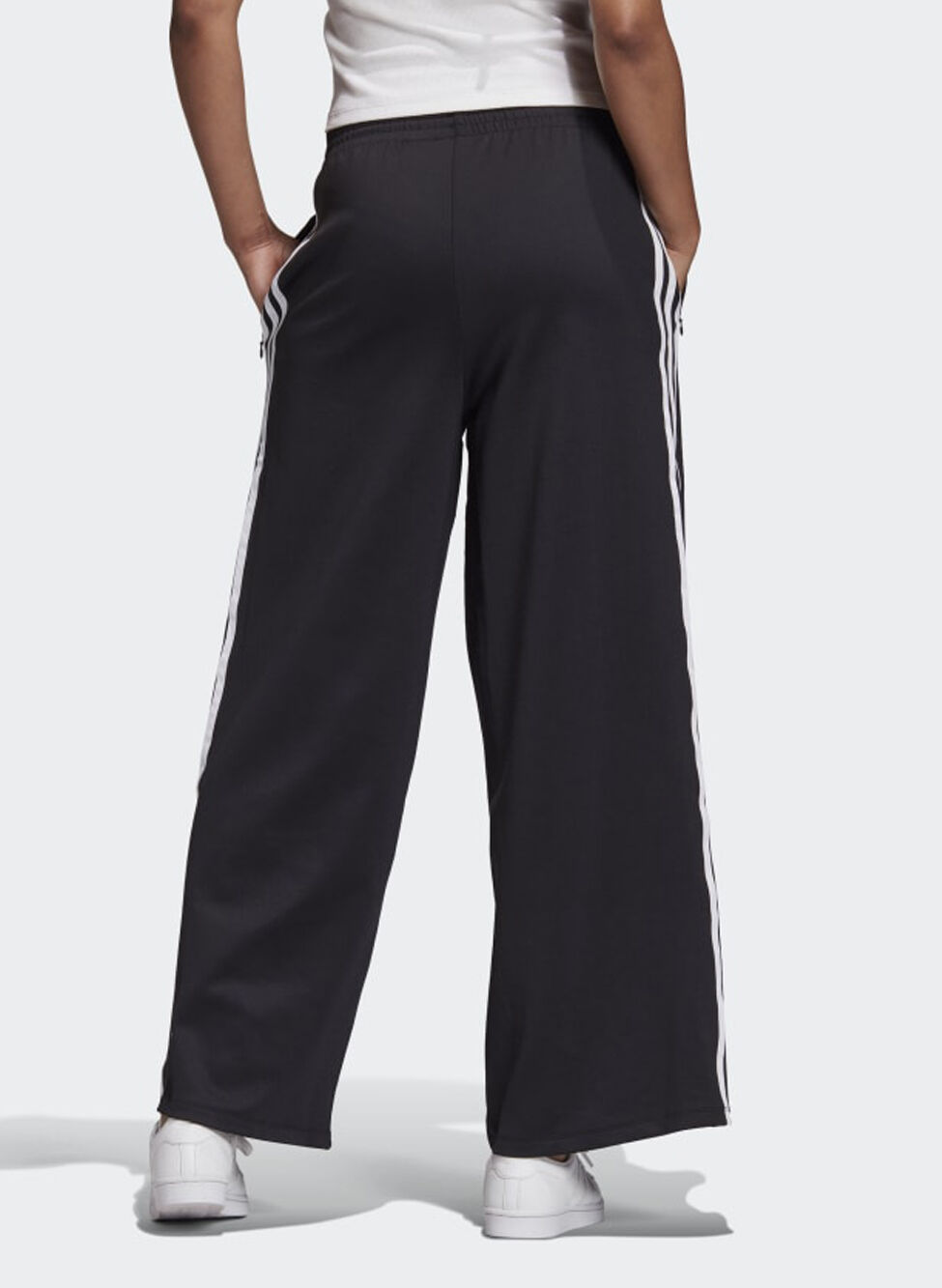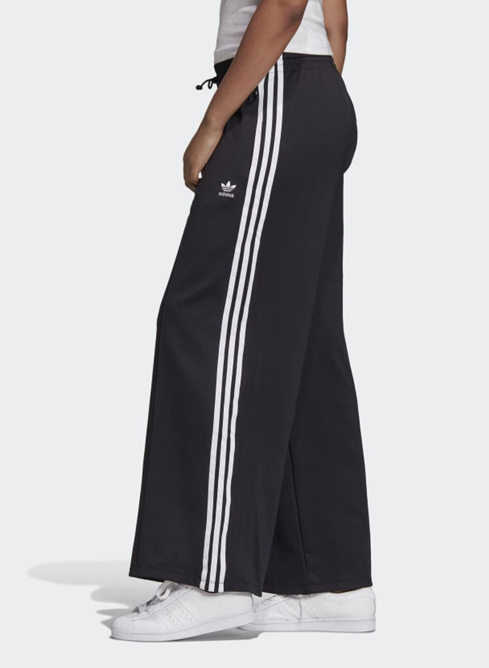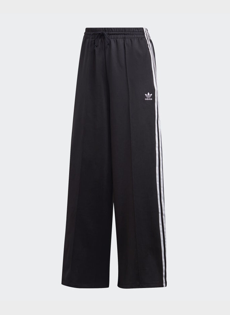 Pantalone sportivo con gambe larghe e girovita con elastico e cordino.