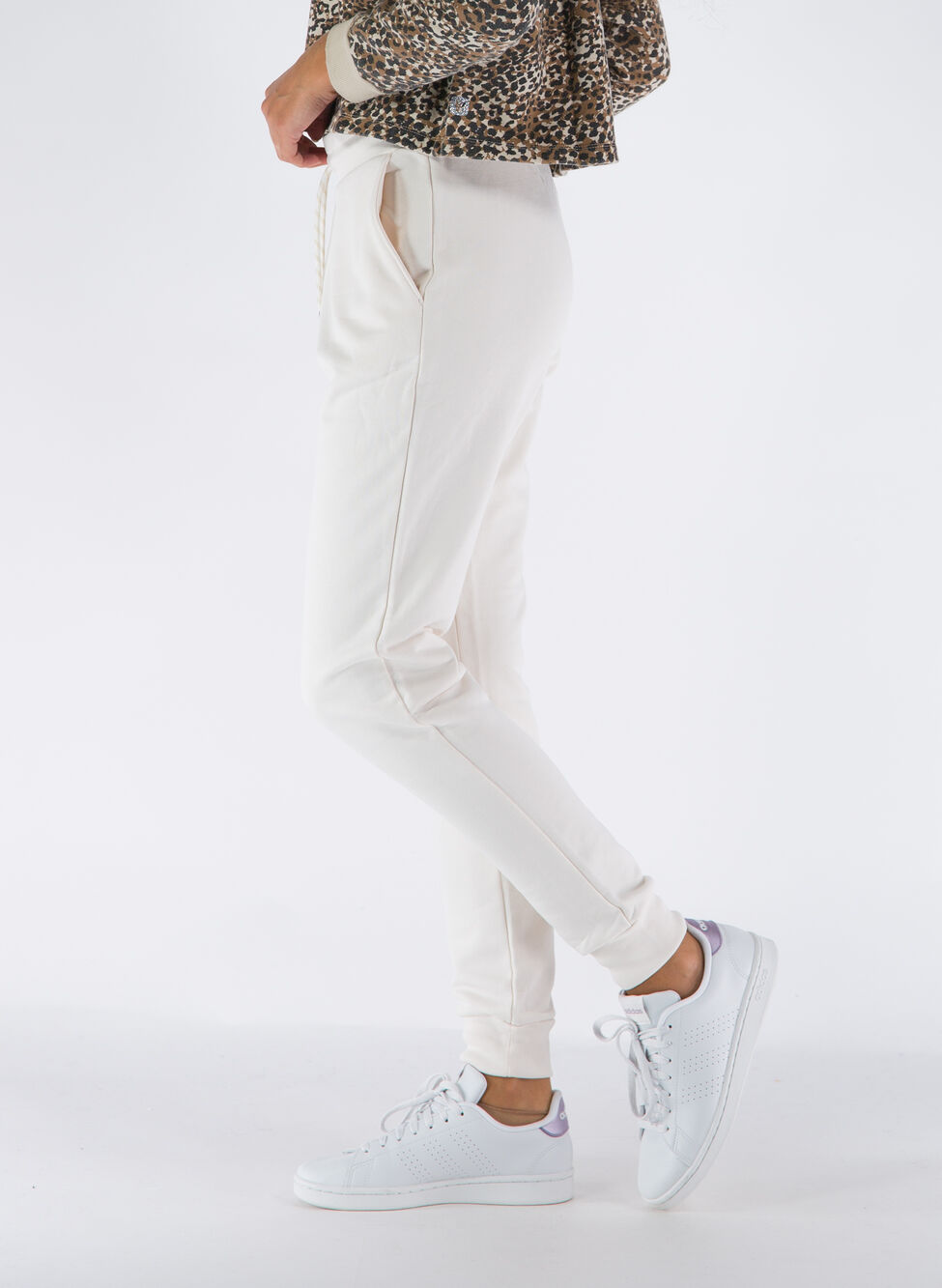 Pantalone sportivo da donna con elastico alla caviglia e elastico in vita con coulisse. Tasche aperte laterali.