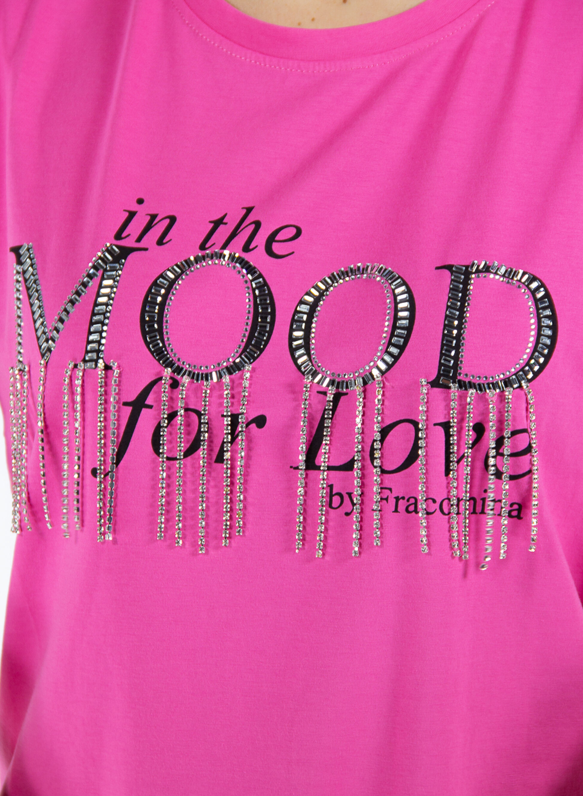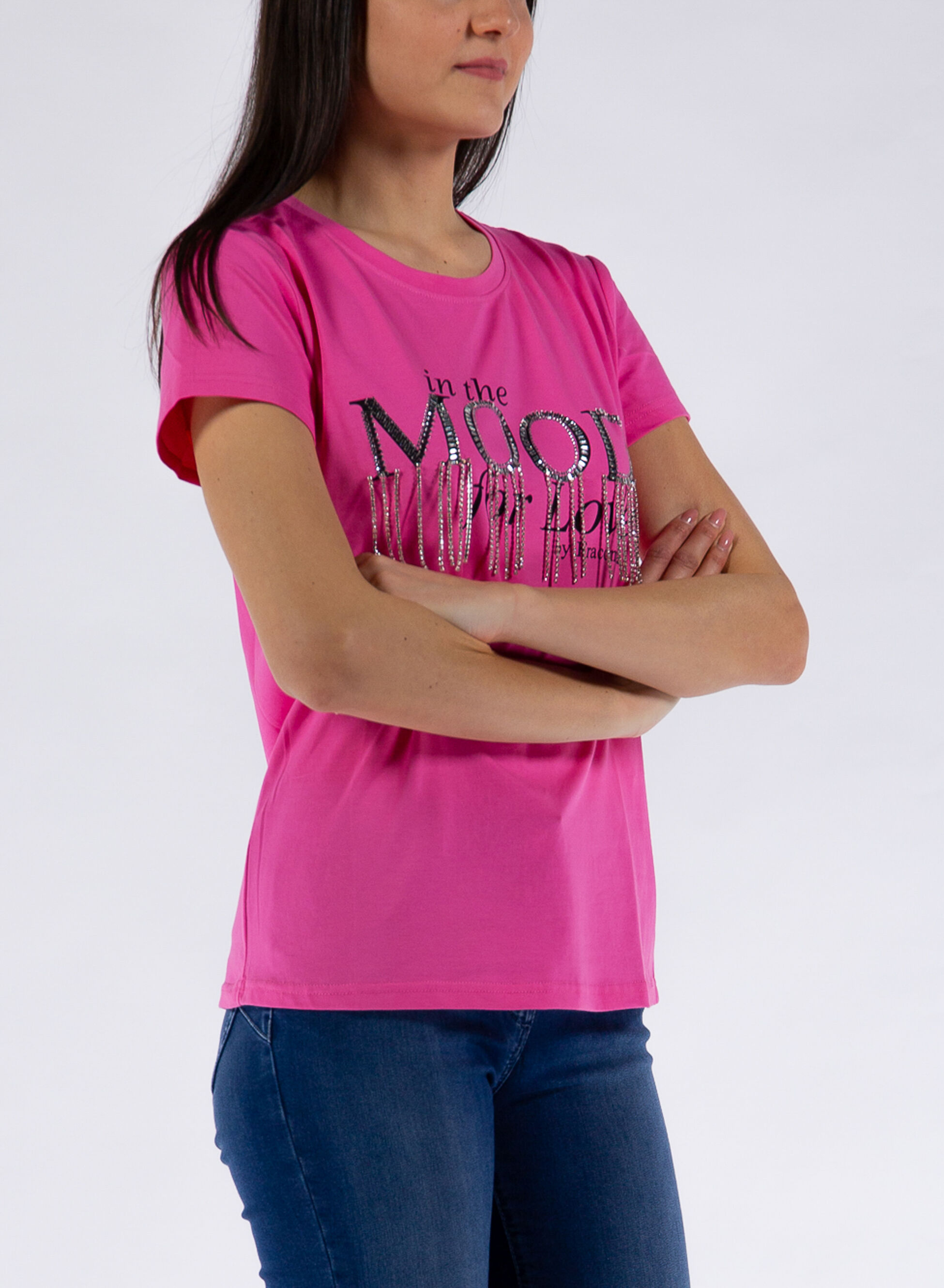 T-shirt da donna realizzata in cotone elasticizzato con stampa lettering frontale e applicazioni gioiello.