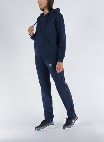 Felpa con cappuccio e coulisse per regolare la vestibilità, chiusura full zip, tasche laterali e orli a costine.