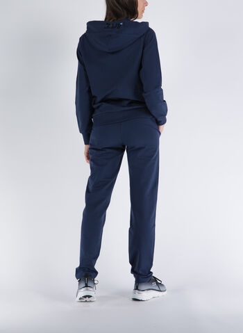 Pantalone modello jogger con girovita elasticizzato e coulisse, fondo dritto e tasche laterali.