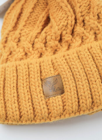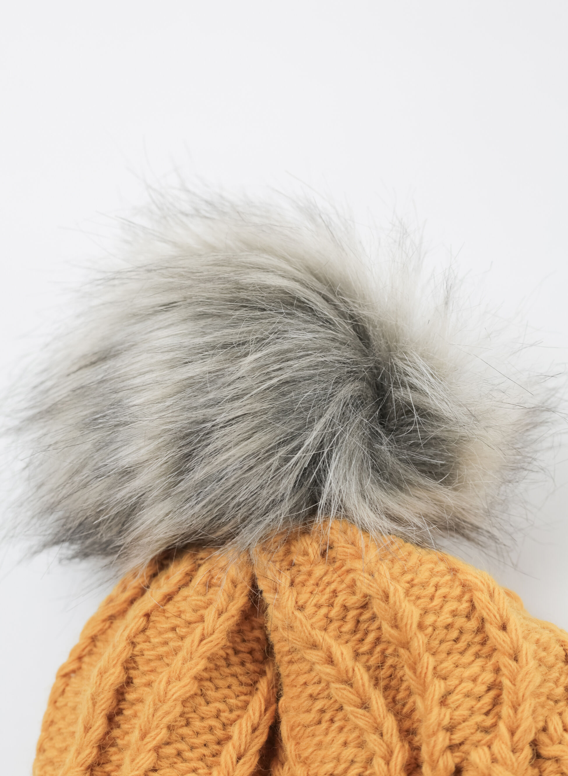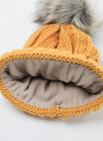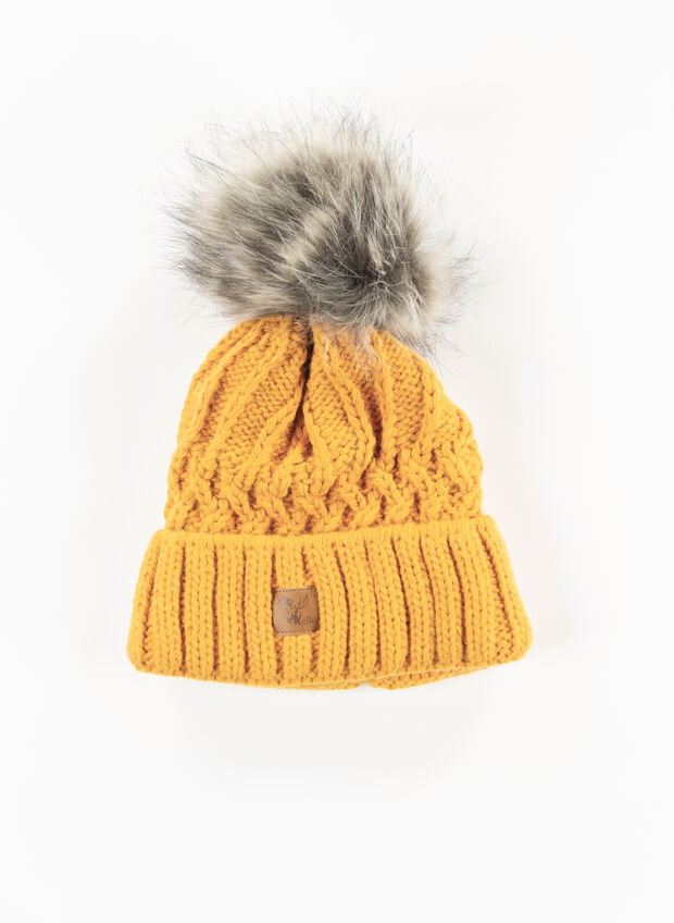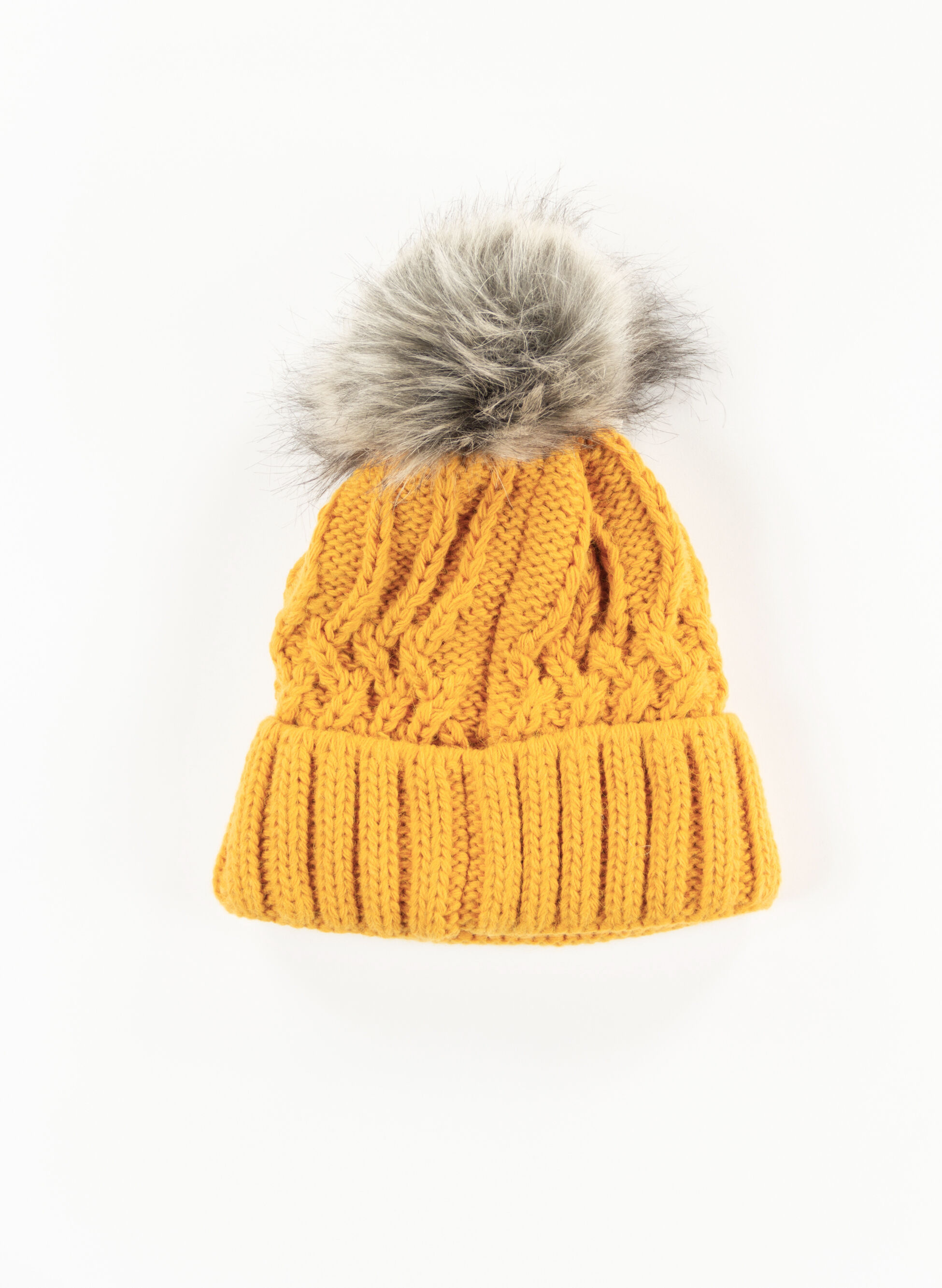 Cappello da donna lavorato a maglia con motivo a treccia con risvolto e pon pon in pelliccia sintetica.
