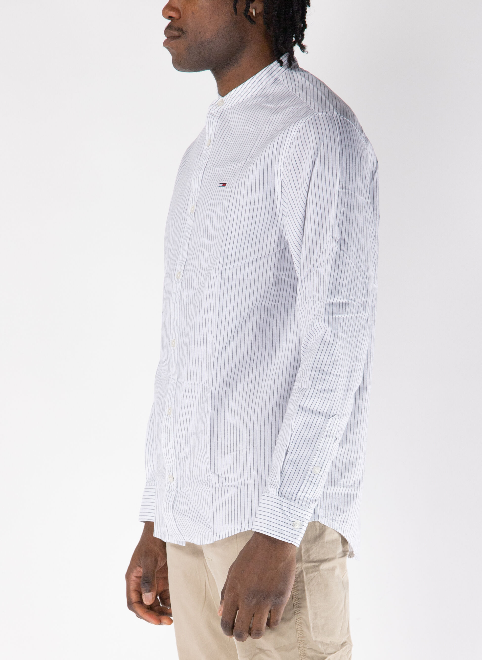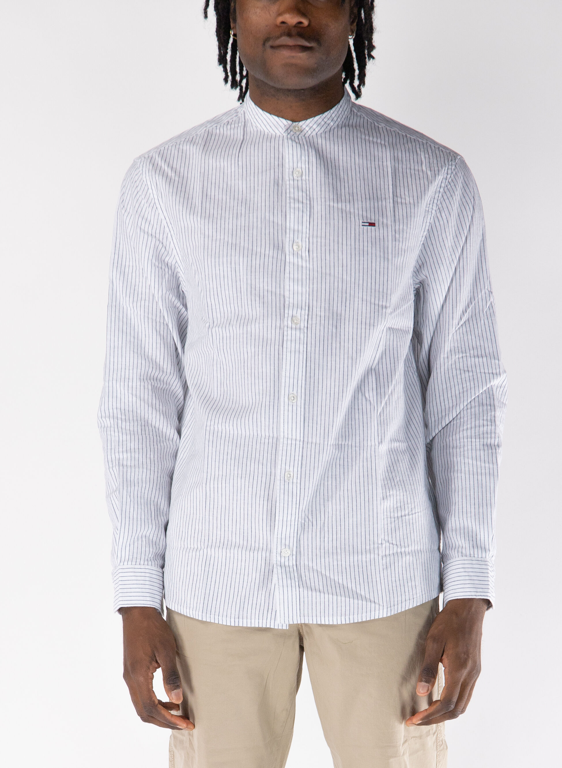camicia a righe con collo alla coreana DM0DM20893 <p>Brand: TOMMY JEANS<br /> Codice Articolo: DM0DM20893</p> Il modello è alto 186 cm e indossa la taglia L. a494318-132504
