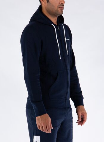 Chiusura con zip frontale, tasche a marsupio anteriori e orli a costine.