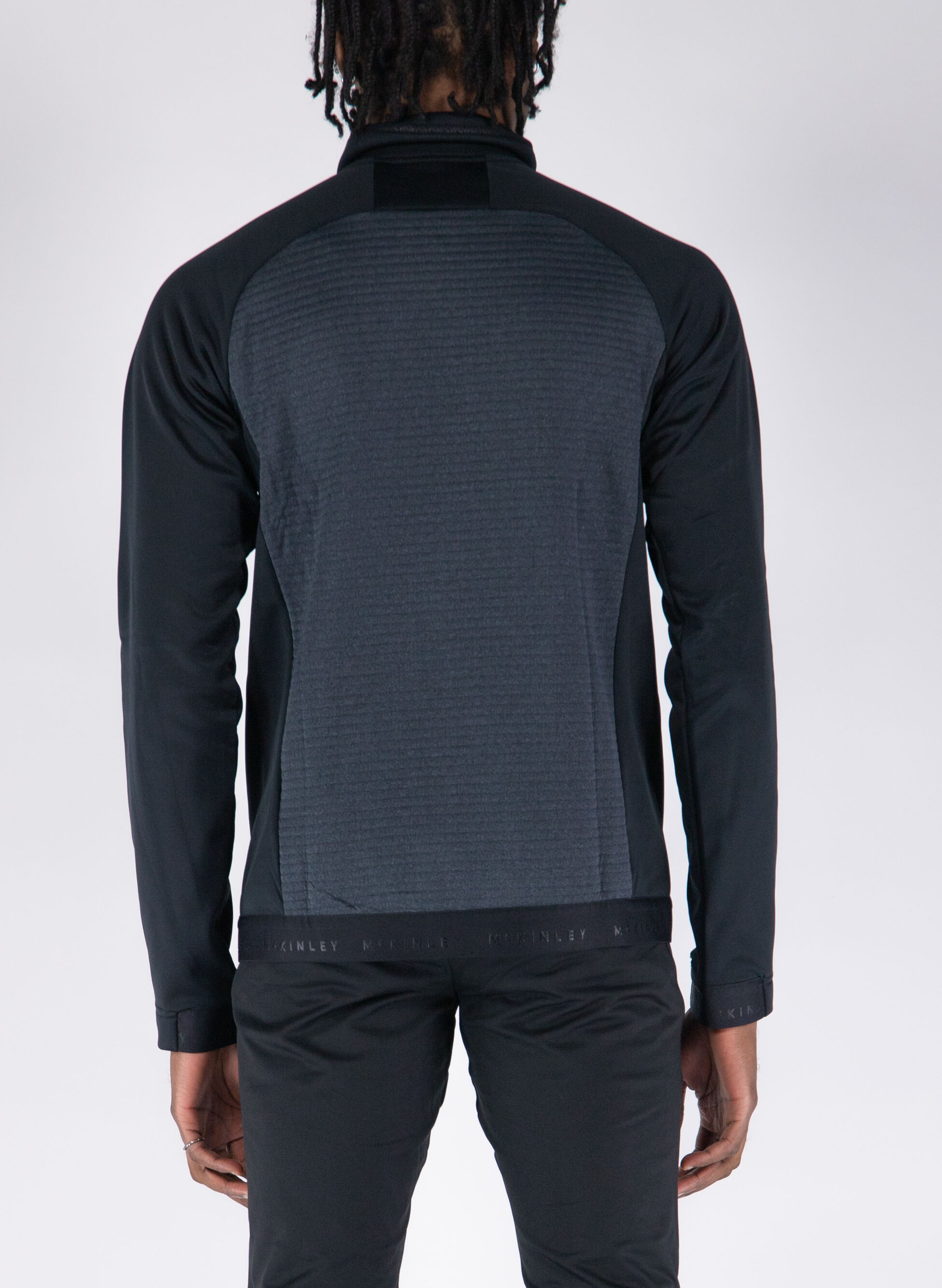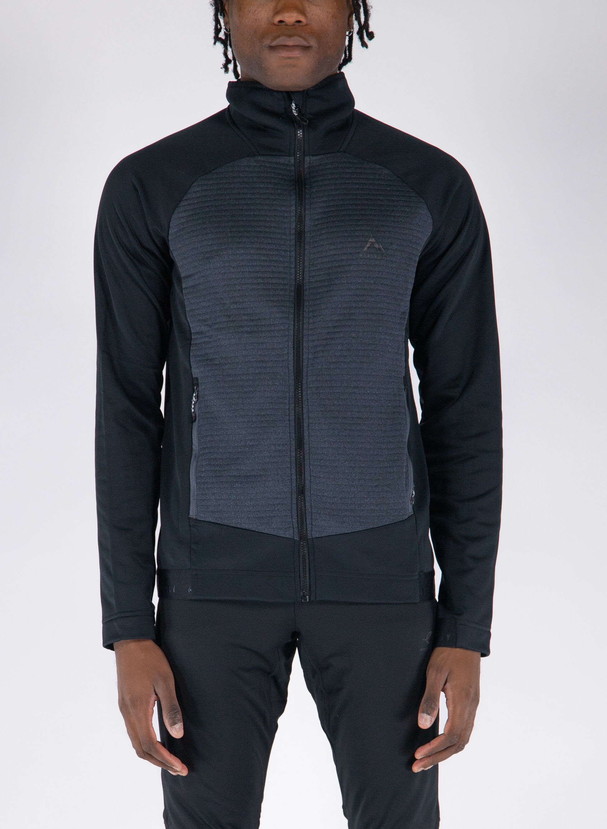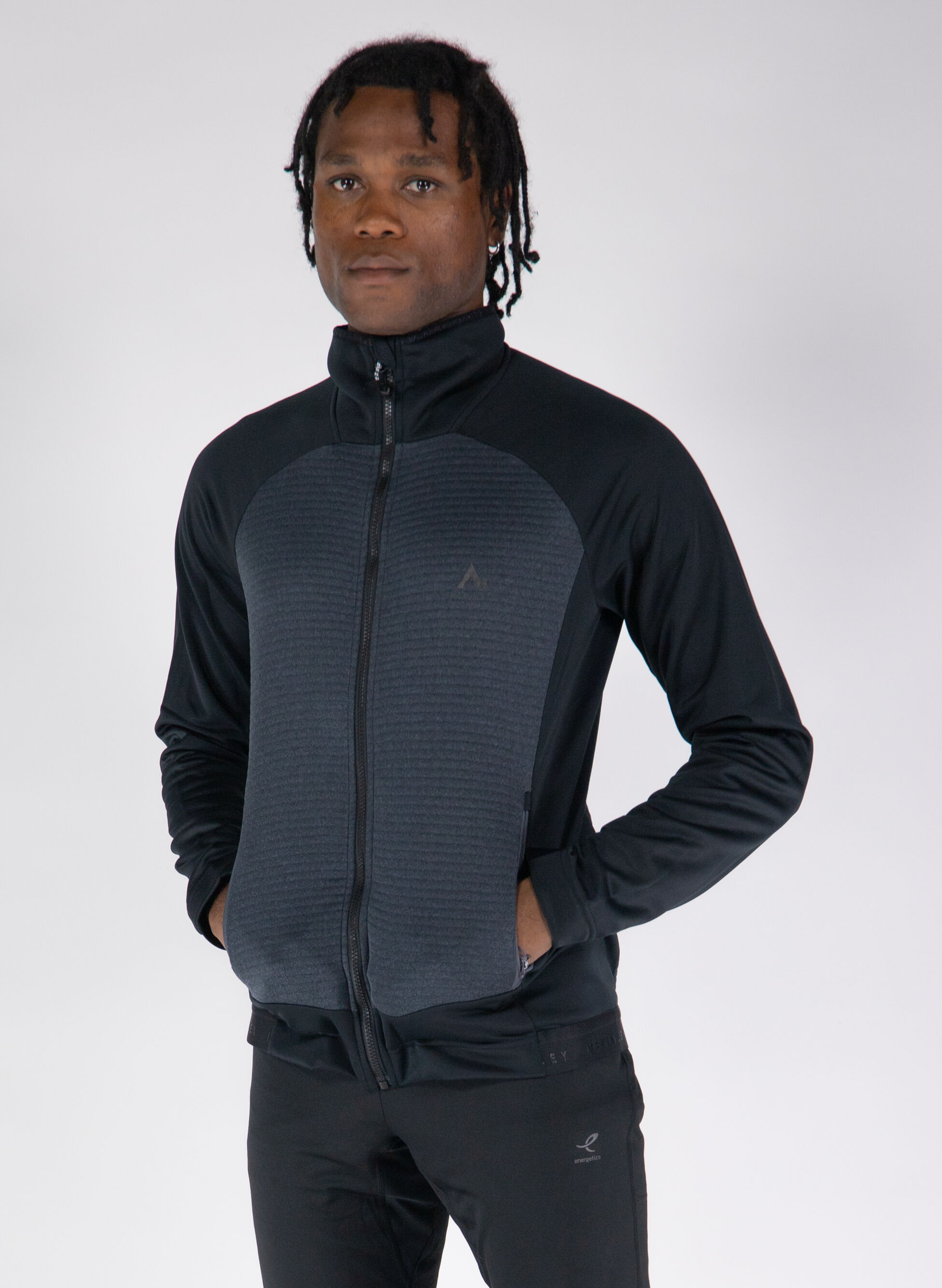 Chiusura full zip, tasche con cerniera a vista, polsini e fondo con fascia elastica.