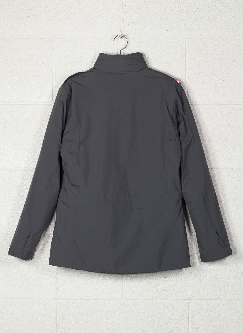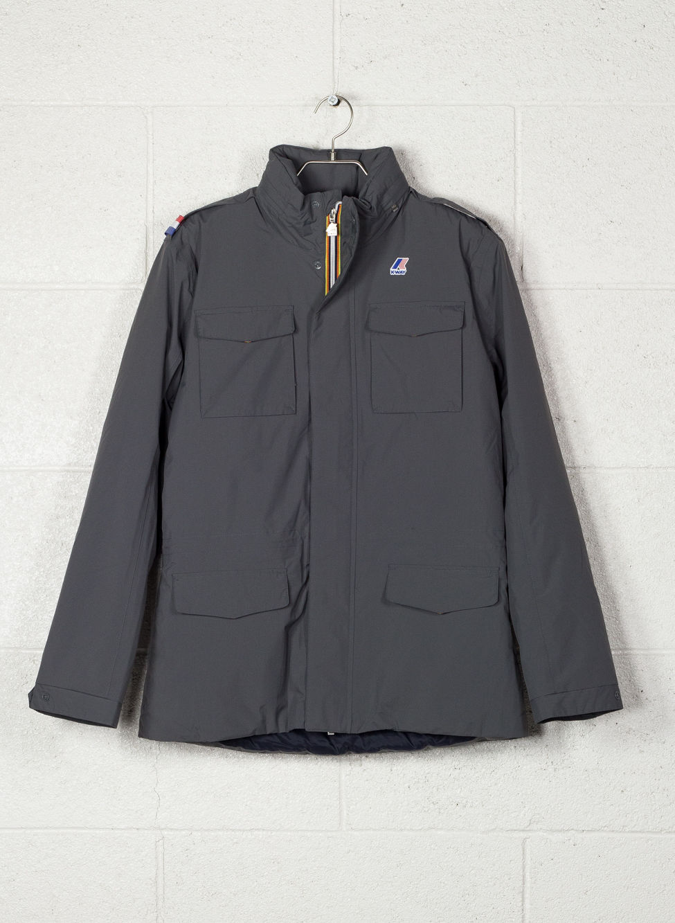 Chiusura full zip con patta di copertura e puller in metallo.
