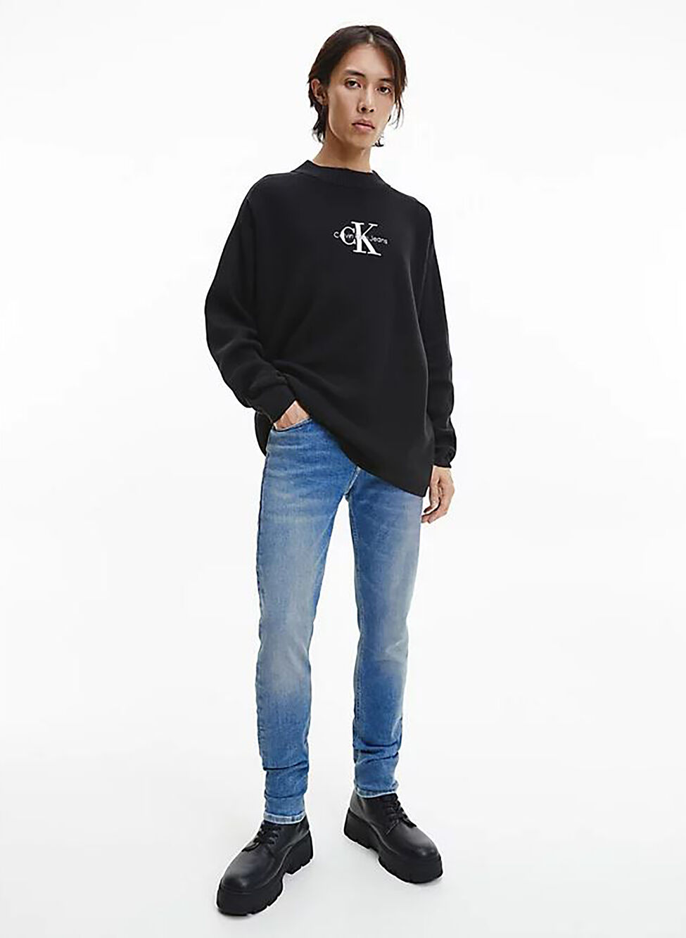 Jeans da uomo di Calvin Klein in cotone elasticizzto dalla vestibilità skinny. Chiusura con zip e bottone.