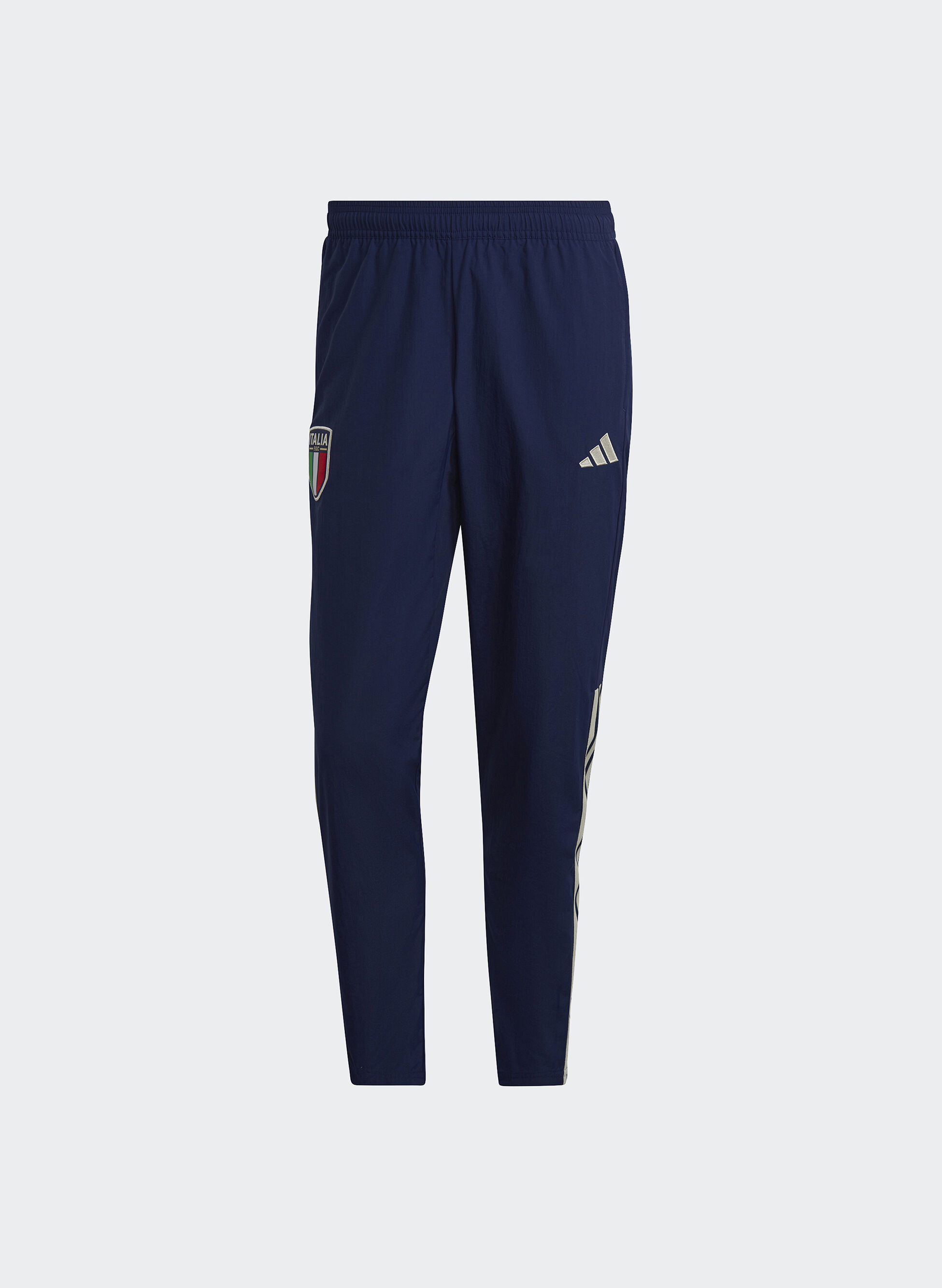 Pantalone sportivo da uomo Adidas da calcio realizzato poliammide riciclato con logo stampato a sinistra e patch Italia a destra.